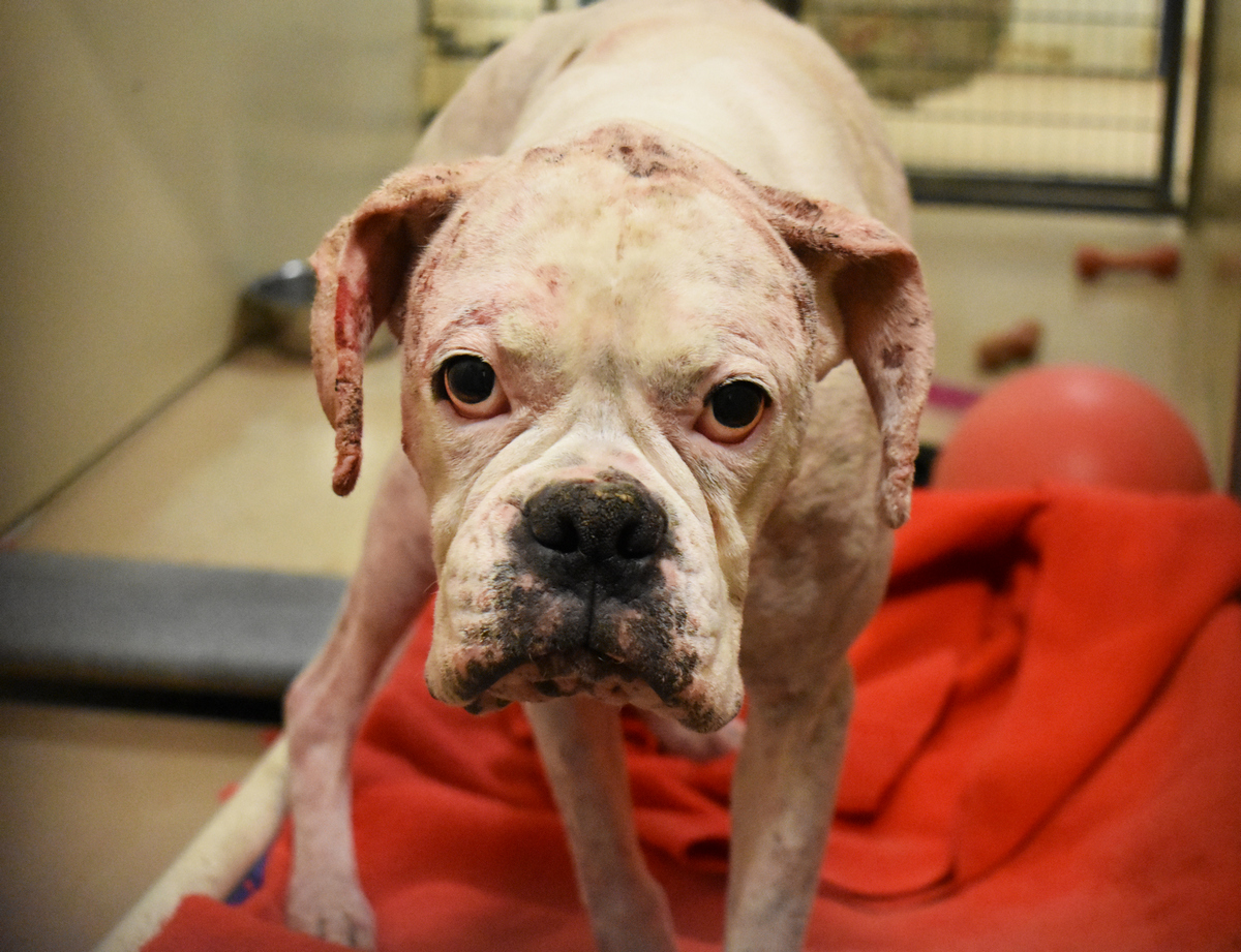 When Chloe first arrived at Lollypop Farm in early December, this 6-year-old Boxer mix was in a sad state. Suffering from alopecia and dermatitis, she was covered head to toe