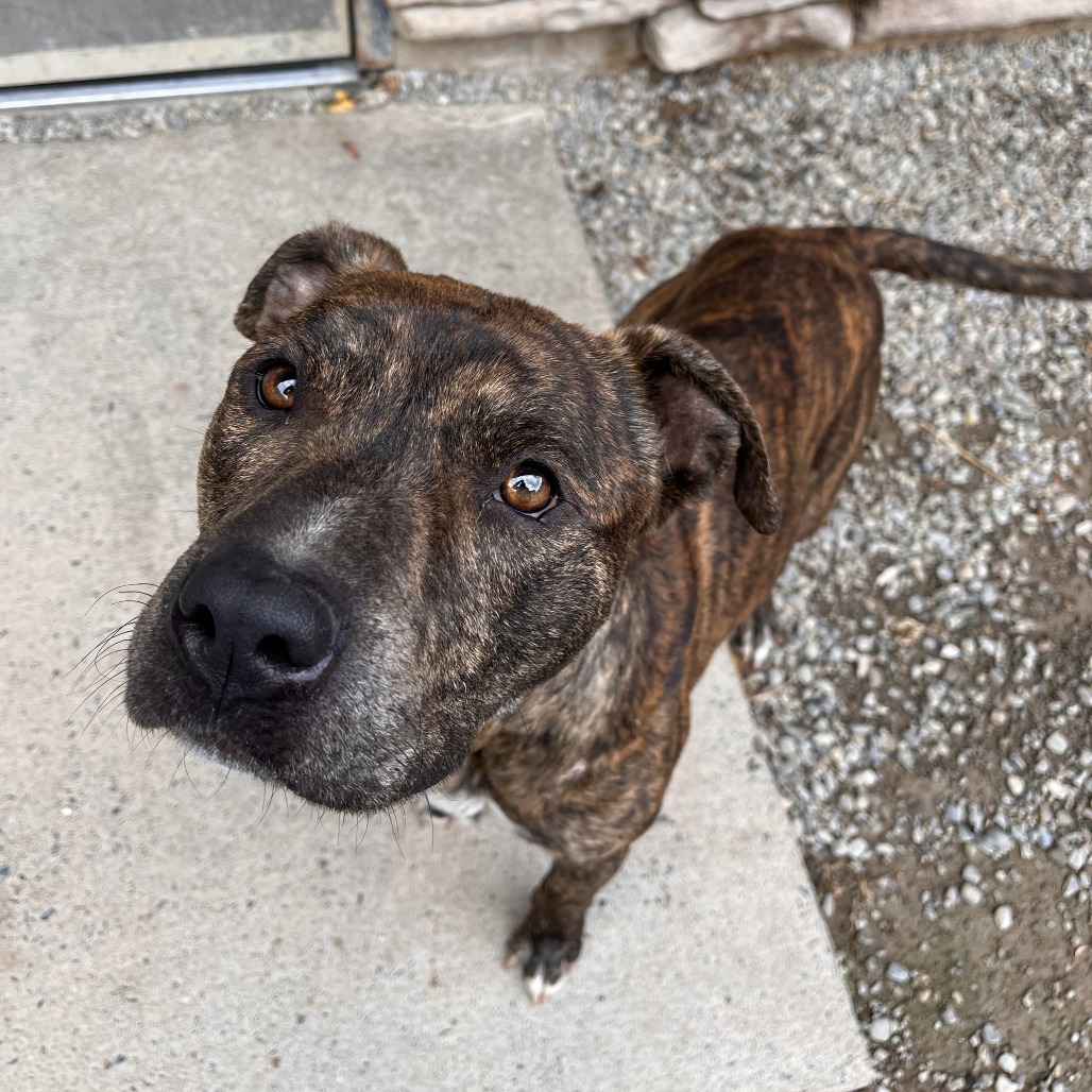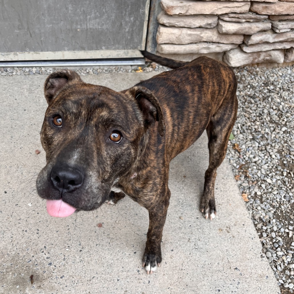 If you are looking for a brindle man that will keep you smiling all day long, then have we got the dog for you! Goofy Desmond is a two-year-old man who is full of pluck and vigor. Desmond would appreciate someone who will help him work out his zoomies and give him some excellent exercise. His favorite activities include going for long walks and eating whatever cheeses you send his way. We do not have any history of how this awesome guy would do living with other dogs or cats in a home. Our adoption counselors can discuss the best ways to gradually introduce him to any resident cat(s) you may have. However, at this time, Desmond is currently being treated for a medical condition that does not allow him to live in a home with other dogs. Once he's cleared of this condition (fingers crossed!) in March, he will be eligible to go to a home with other dogs. Fans of the outdoors will find a kindred spirit in Desmond. He is the type of guy who would love the chance to explore the woods or beach. He is always happy to see our staff come up to him with a harness and leash. So if you want to help this man change his fortune, come meet Desmond! He hopes to see you in another life, brother!