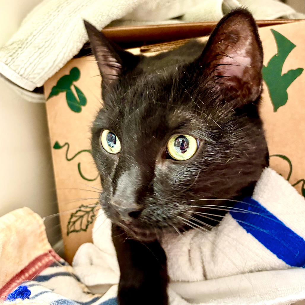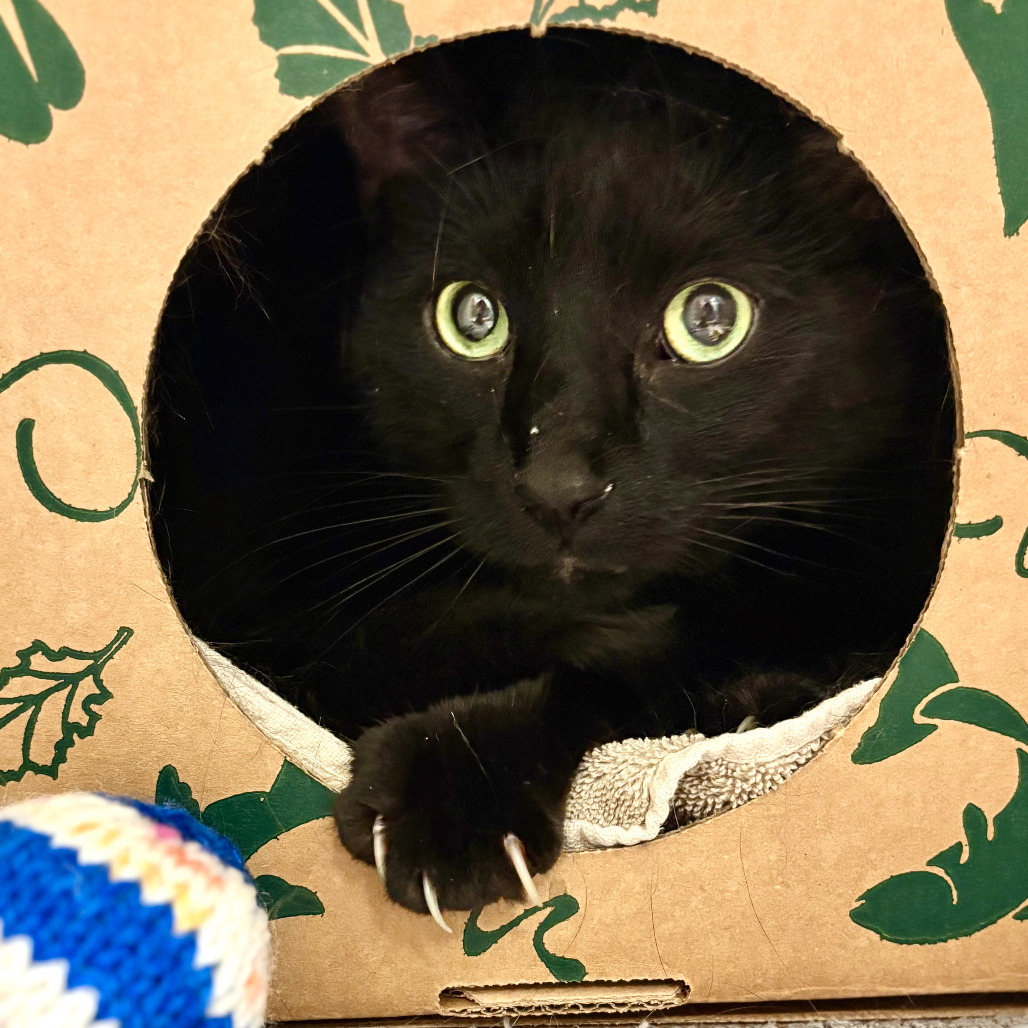Eckhart is a wise 13-year-old ebony gentleman, quiet as moonlight and ready for a calm retirement home where peace is the rhythm of each day. With little history to share, he lets his heart speak instead—seeking soft beds or snug boxes to curl into, a soothing voice to anchor him, and gentle cheek scritches offered with patience. He loves the slow joy of rolling in catnip, the comfort of a serene room, and the simple happiness of a good wet-food meal. In the right tranquil home, this sweet elder will settle in like a warm whisper, grateful for a soft place to rest.