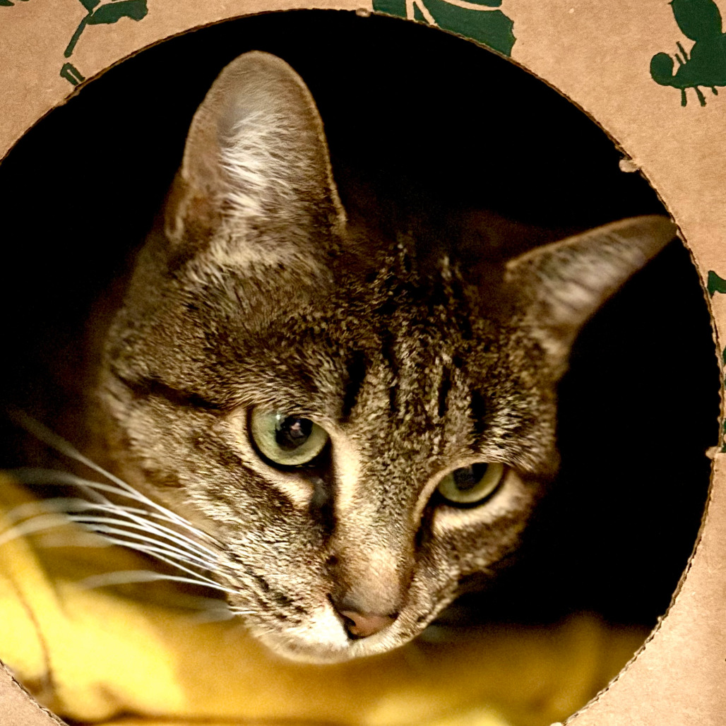 Saoirse is a petite 1-year-old brown tabby with a tender heart, carrying the quiet resilience of a girl once abandoned but still hopeful. She dreams of a serene home where soft voices drift through the air and cozy boxes wait for her gentle naps. A social eater, she finds comfort when her person lingers nearby at mealtimes, sharing the moment with her. Read to her in soothing tones, offer slow cheek scritches when she’s ready, and she’ll begin to unfurl like a shy blossom. With patience, calm, and gentle love, she might just blossom into a treasured friend.