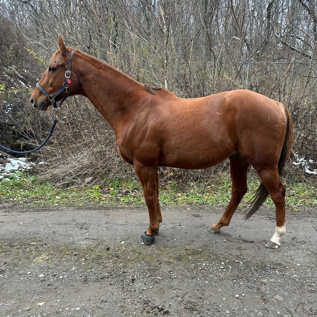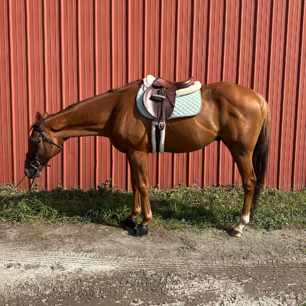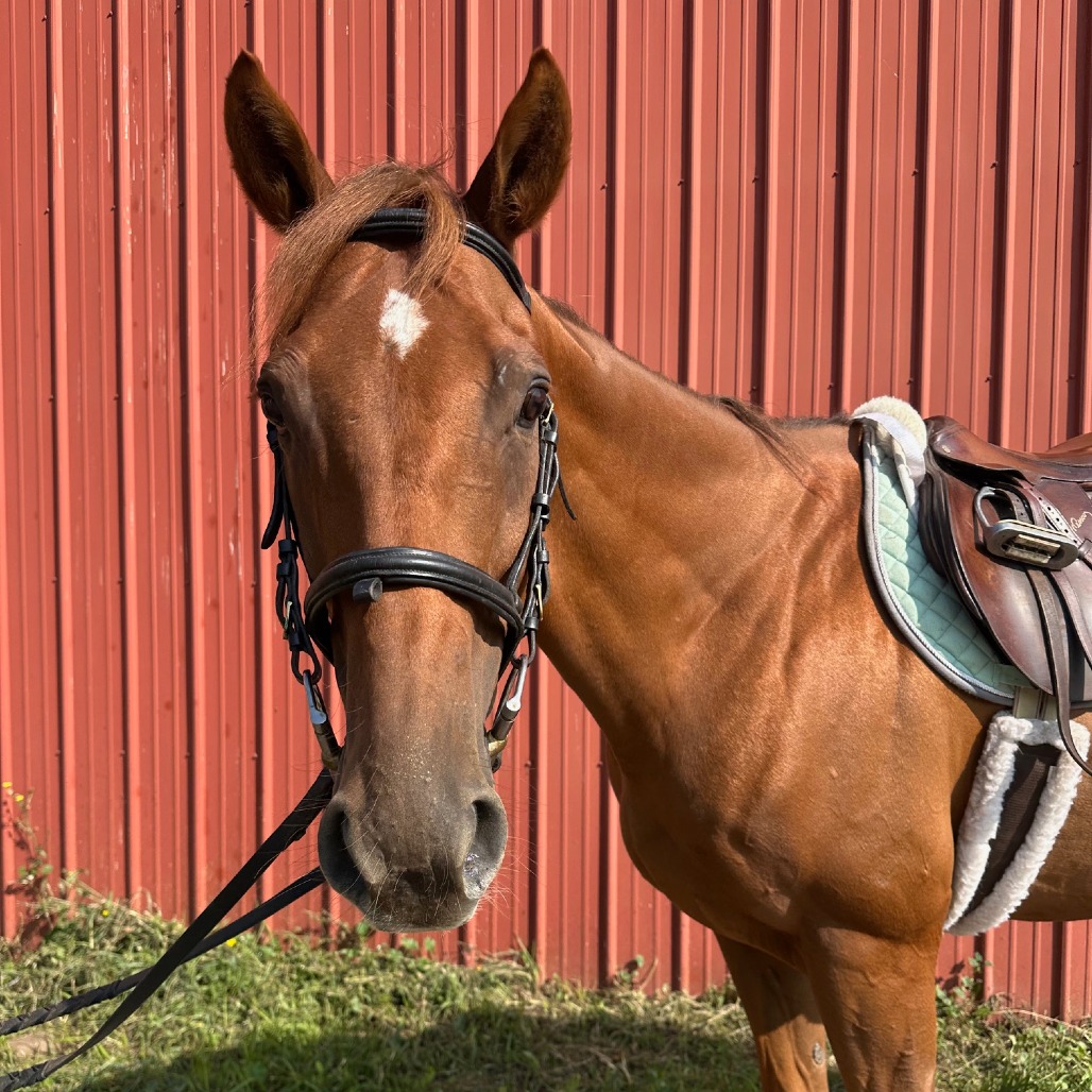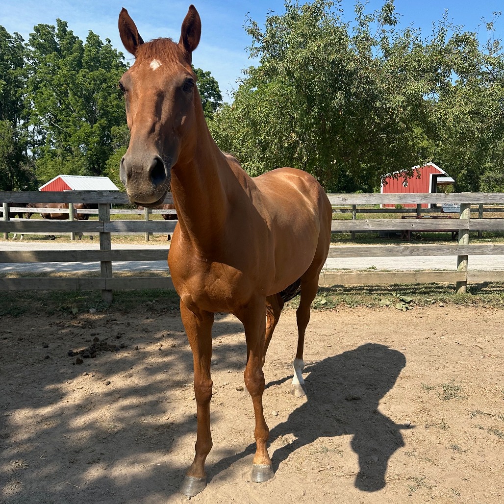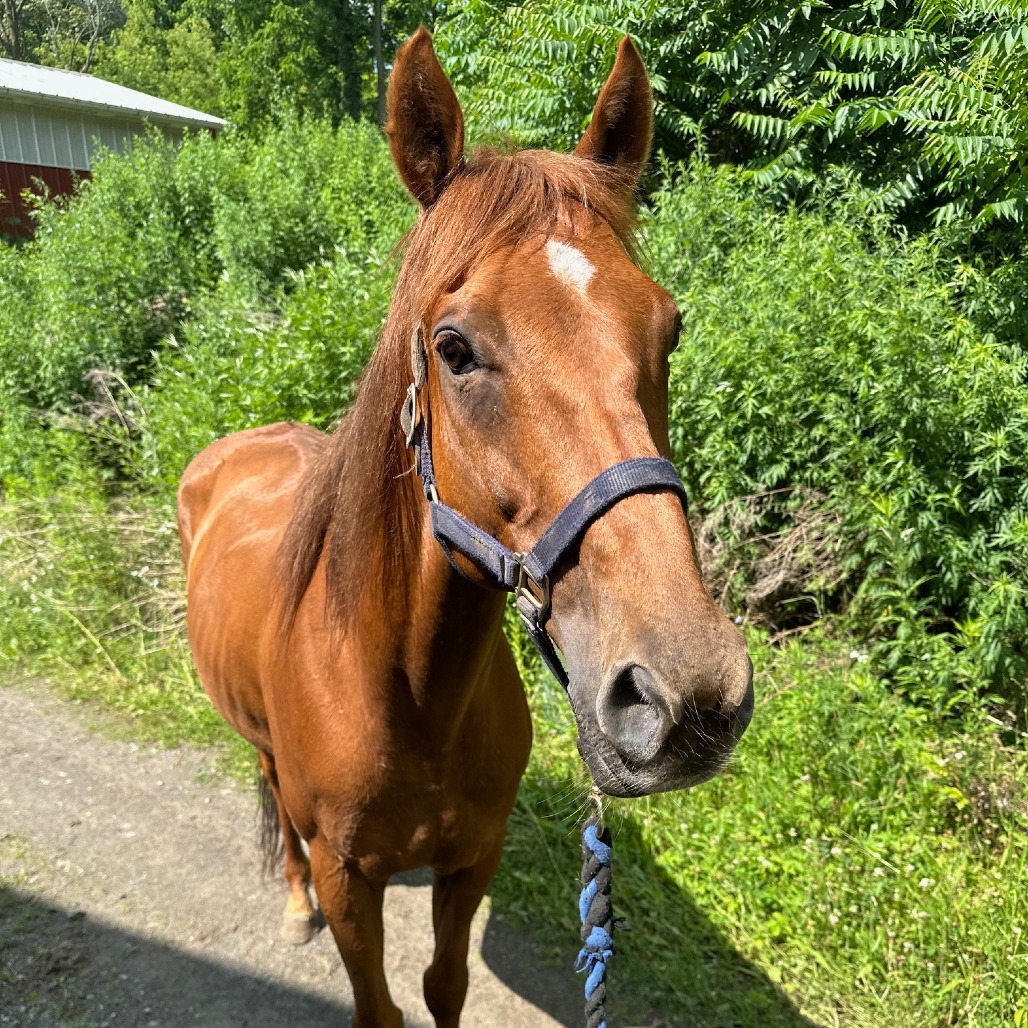 This chestnut cutie pie is Candyrock, a 16.1hh TB. He retired sound from the track with no injuries and an impressive 50+ starts, earning him warhorse status. He had a year off work before being surrendered to us through no fault of his own. Currently going walk/trot under saddle in the arena, could go in any direction. He's great for tacking and grooming, as well as standing for the farrier. Candyrock has lived well with both mares and geldings. So far, he has been more playful with geldings and more passive with mares. A staff favorite, we hope you'll consider adding Candyrock to your family. He is suitable for an experienced rider or someone who is willing to work with a trainer. Adoption Price: $2200