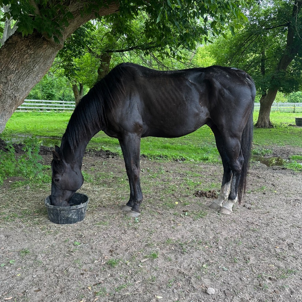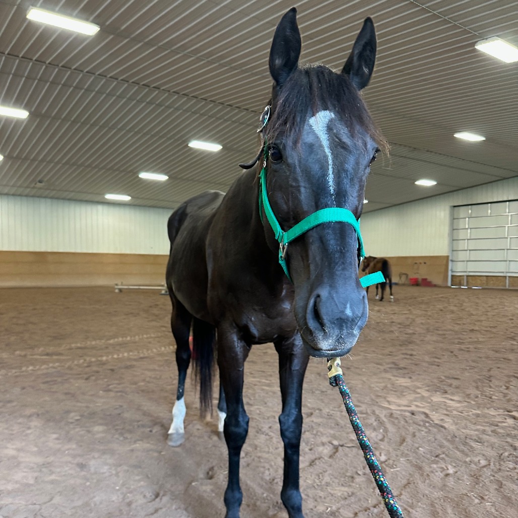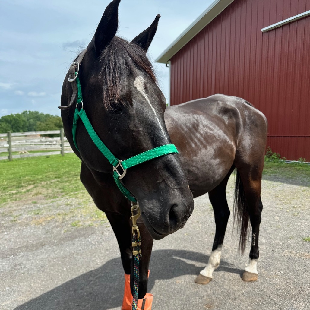 Nike Registered OTTB "Pinetree Pro" DOB: 4/05/2011, 16.2hh *Updated winter pictures available soon. Growing up on the track, Nike earned more than $109k! Having had several owners during that time frame, we're hoping we can help Nike find his forever home. For a number of years prior to coming to Lollypop Farm, he had just been loved on as a pasture pal. Nike has been fostered by our trainer so that she could work with him to be a rideable horse. Coming to us underweight and under-muscled, we knew it would be a journey. He lunges well and has great ground manners. Unfortunately, he has made it clear that he doesn't want to be ridden. If an adopter would like more info on this, we'd be happy to share what we have tried so far and how he reacts. On the other hand, he has done so much in his life and would be happy to be loved on for the rest of his life as a pasture pet. Nike has lived well with both mares and geldings. He came to us with his friend Lindsay, another of our adoptable horses, where they lived in a group setting. He has always been bottom of the totem pole during turnout. We hope you'll consider giving this gorgeous boy the retirement he deserves. He will have a medical waiver stating that at this time, he is companion only, and may never be rideable. If an adopter would like to pursue more medical investigation and intervention to see if can be happy and comfortable while being ridden, they may do so. Adoption Price: $600