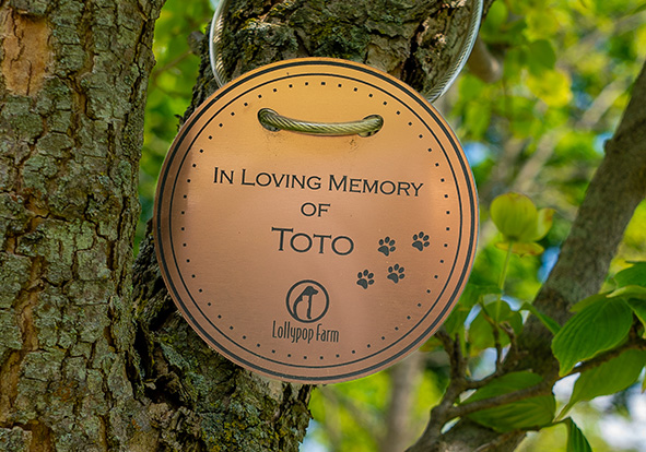 These unique weather-proof tree charms honor the memory of a beloved pet. For your donation of $750, your custom engraved charm can adorn a tree in your backyard or on the Lollypop Farm campus.